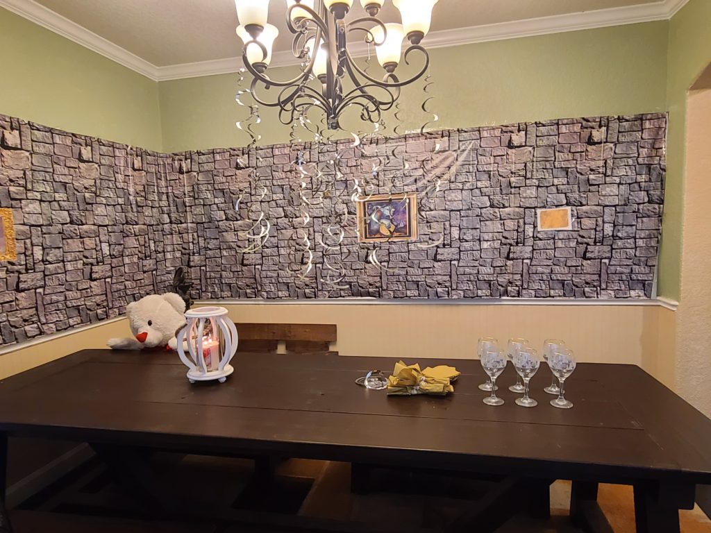 A friend made a couple of small balloon columns. For the stone wall, we printed pictures off the internet to give it a castle flair. We brought out our fancy dishware for the evening
